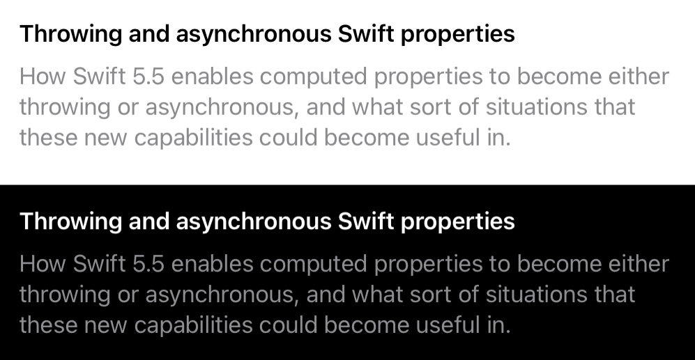 Both SwiftUI and UIKit also offer a suite of colors that are a bit more abstract, which will then resolve to specific, context-appropriate colors at runtime. For example, when using SwiftUI, the primary and secondary colors are often particularly useful when working with text, as they’ll make our text colors match the ones used throughout the system: