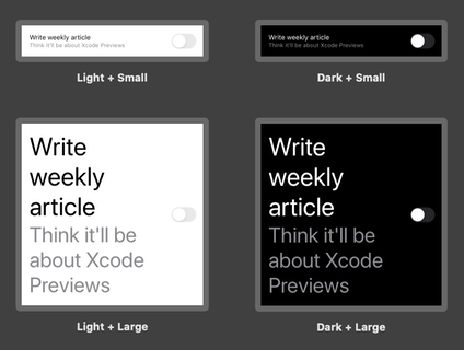 However, what color scheme that our previews will be rendered using is just one of many different environment parameters that we can tweak. For example, we can also tell SwiftUI to preview our component using a given size category (which is what the system’s dynamic type settings translate into), and even control what device that the preview will be rendered on: