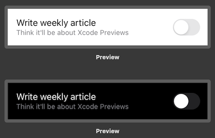 While the above preview setup will render our component itself in dark mode, its surroundings will still remain in light mode, which (given that our view doesn’t have a background color) gives us white text rendered on a white background. Not great.